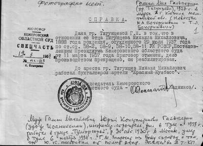 8. Справка Прокуратуры Кемеровской обл. о реабилитации Тигунцова М.М. и признании сына, Тягунцева Н.М. пострадавшим от политических репрессий.