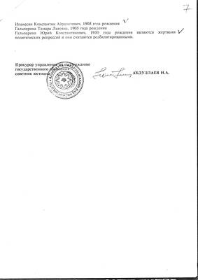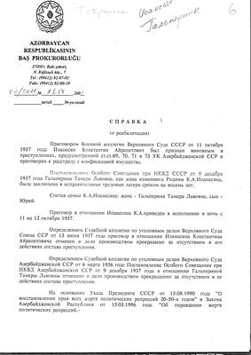 7. Справка Прокуратуры Республики Азейрбайджан о реабилитации Иоанесян К.А, Гальпериной Т.Л. и Гальперина Ю.К. (3 листа)