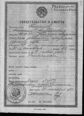4. Свидетельство о смерти Тигунцова М.М. 09.08.37 по причине расстрела. (1 лист)