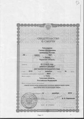 11. Свидетельство о смерти Гальпериной Галины Михайловны 09.12.2015, выданное Комитетом ЗАГС гор. Тулы 10.12.2015 (1 лист)