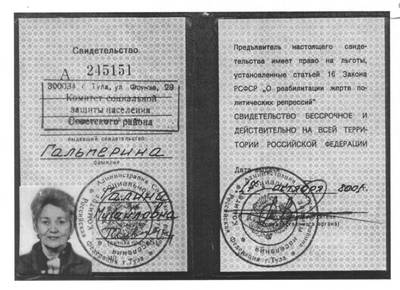 9. Свидетельство №245151 о праве на льготы, установленные ст.16 Закона РСФСР «О реабилитации жертв политических репрессий», выданное Гальпериной Галине Михайловне Комитетом социальной защиты населения Советского района гор. Тулы 17.10.2001