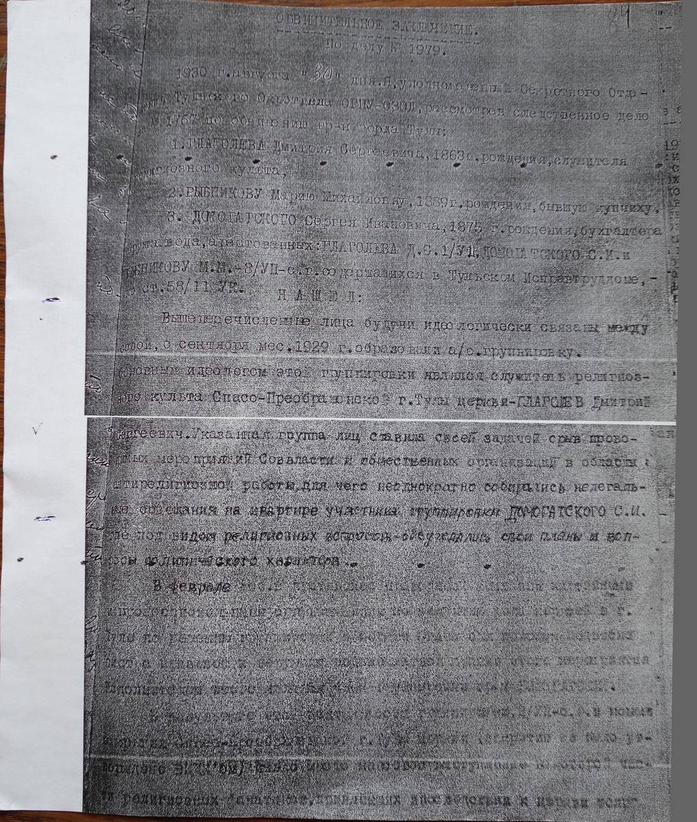 В Спасо- Преображенской г. Туле церкви следует сказать, что там создалась определённая группа лиц в составе священника Глаголева Дмитрия Сергеевича, Рыбниковой М.М. и Домогатского С.И. ( не члены церковного Совета) и председателя церковного Совета Сахарова, которые будучи заинтересованы в своих лично выгодах, зорко следили за тем, чтобы Соввласть не произвела закрытие этого храма.
