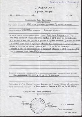 3. Справка УВД Тульской обл. о реабилитации Кондратьевой Э. Я. от 11.06.1997 (1 лист)
