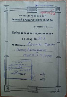 1940 года июля 1-го дня, Врио Военного Прокурора войск НКВД Тульской области военно-юрист 2-го ранга Лавринович, рассмотрев поступившие из следственной части УНКВД Тульской области дела № 74/40 по обвинению Долинино-Иванского Василия Александровича, рождения 1899 года происходящего из дворян-помещиков Чернского района Тульской области. Отец его имел земли 500 десятин, спиртоводочный завод. Всё его хозяйство впоследствии национализировано. Родной брат его в 1940 году за вредительство, органами НКВД был арестован, осуждён сроком на 15 лет ИТЛ. Сам Долинино-Иванский В.А. женат, нигде не работал, по статье 59 ч.II УК РСФСР –