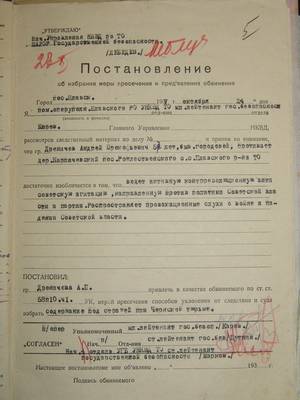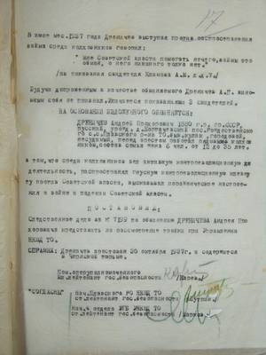Дреничев Андрей Прохорович среди колхозников ведет активную контрреволюционную деятельность, распространяет гнусную контрреволюционную клевету на Советскую власть, распространяет слухи о войне и падении Советской власти.