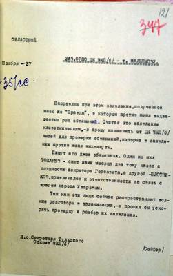 Направляю при этом заявление,полученное мною из "Правды", в котором против меня выдвигается ряд обвинений. Считая это заявление клеветническим, - я прошу назначить от ЦК ВКП/б/ людей для проверки обвинений,которые в заявлении против меня выдвинуты. Пишут его двое обиженных. Один из них ТОКАРЕВ - снят нами месяца два тому назад с должности секретаря Горсовета,а другой -ПЛОТНИКОВ, привлекало я к ответственности за связь с врагом народа Уваровым. Так как эти люди сейчас распространяют всякие разговоры в организации,-я просил бы ускорить проверку и разбор их заявления.