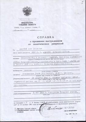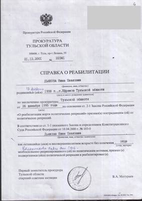4. Справка Прокуратуры Тульской области № 22341 от 21.12.2001 о признании Дьяковой Н.П., как оставшейся в несовершеннолетнем возрасте без попечения отца, необоснованно репрессированного по политическим мотивам, подвергшейся политической репрессии и реабилитированной.
