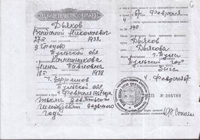 6. Свидетельство о браке П-ШЗ № 204789 от 01.02.1967 между Калашниковой Н.П. с Дьяковым В.Н., выданное Тульским городским ЗАГСом