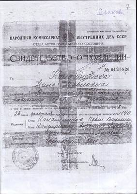 7. Свидетельство о рождении № 0423826 Калашниковой Н.П. 18.02.1938, выданное Ефремовским ЗАГСом Тульской обл. 26.02.1938