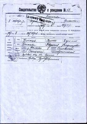 4. Свидетельство о рождении № 58 выданное 08.10.1927 г Короваевским с/с Сычевского р-на Смоленской обл. на Богачеву Ирину Семеновну