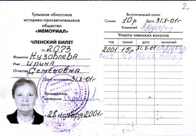3. Членский билет № 2073 Кузовлевой И.С., выданный 28.11.2001 г. (2 листа)