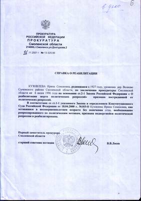 7. Справка Прокуратуры Смоленской обл. № 13-325-96 от 6 июня 1996 г. о признании Кузовлевой Ирины Семеновны пострадавшим от политических репрессий