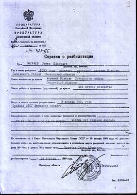 На основании ст. 1 Указа Президиума Верховного Совета СССР от 16 января 1989 года «О дополни- тельных мерах по восстановлению справедливости в отношении жертв репрессий, имевших место в пе риод 30-40-х и начала 50-х годов» гр-н Богачев Семен Ефимович реабилитирован 14 апреля 1989 года.