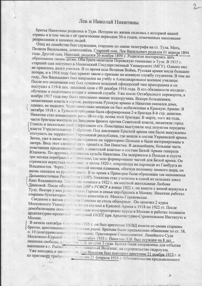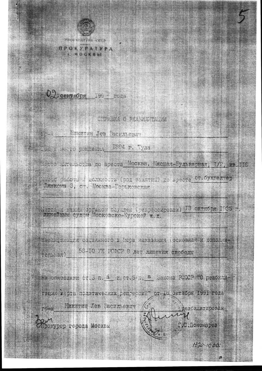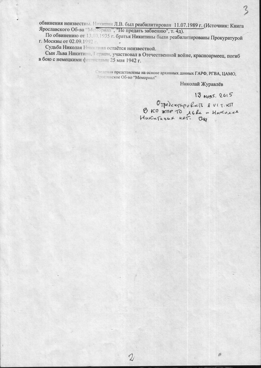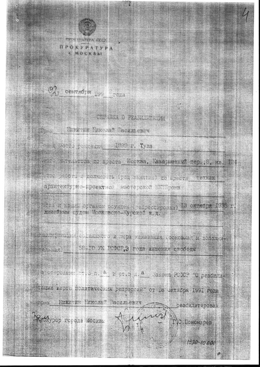 По обвинению от 13.10,1935 г. братья Никитины были реабилитированы Прокуратурой г. Москвы от 02.09.1992 г.