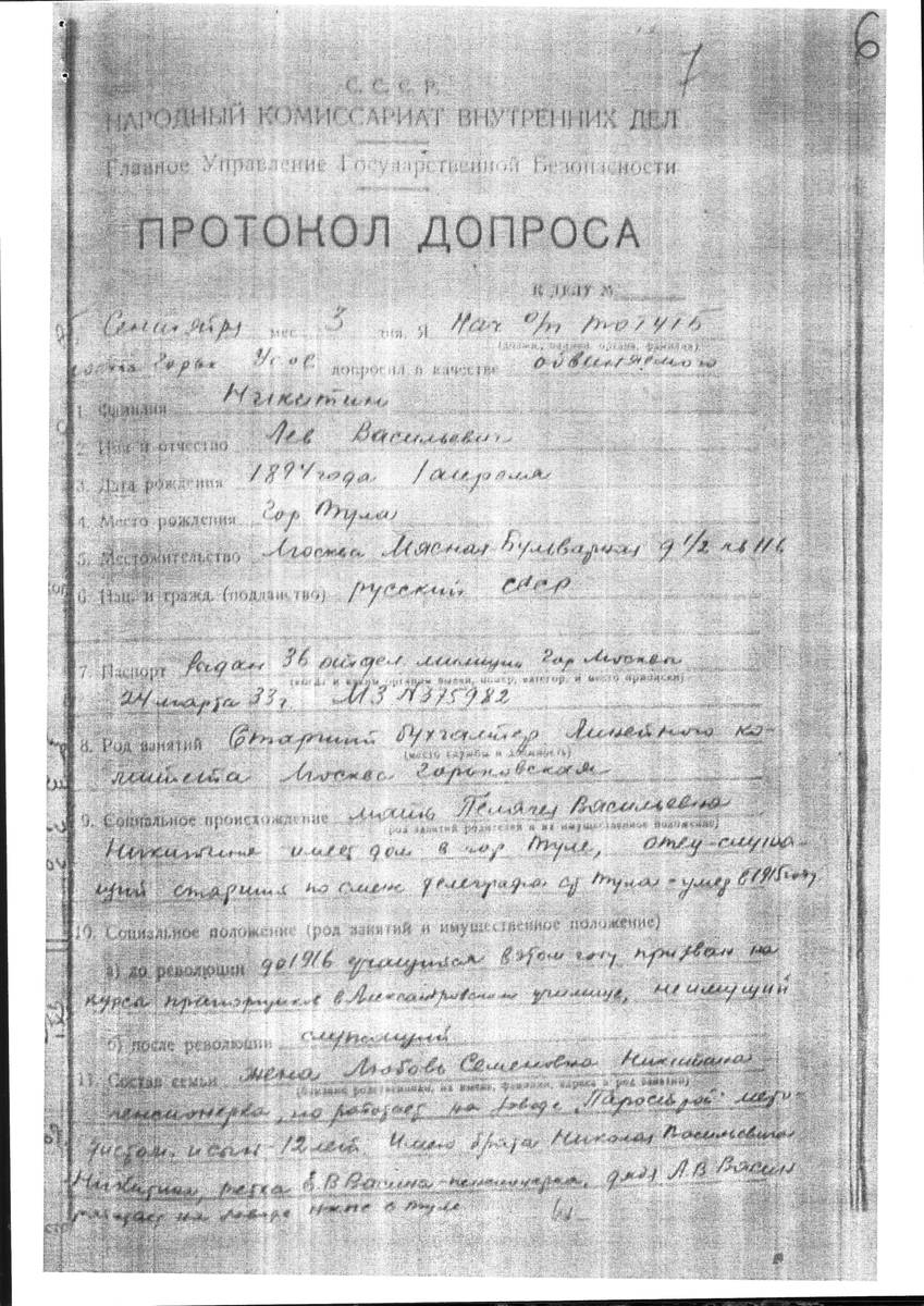 5. Протокол допроса Никитина Л.В. (ксерокопия титульной страницы) от 03.09.1937 (1 лист)