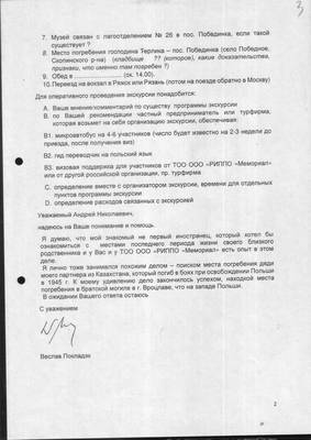 1. Письмо Веслава Покладэка с просьбой об организации экскурсии в пос. Аварийный Скопинского р-на на место смерти Евгения Терлика