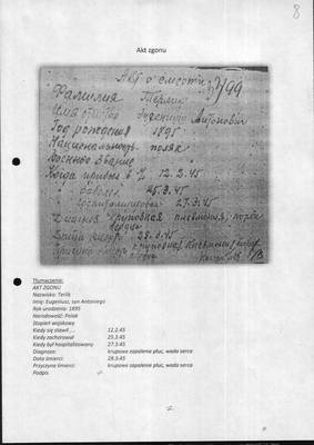 Род. в 1895 г., м.р. село Пристань Маковского уезда Ломженской губернии, поляк. С января 1945 года находился в ПФЛ № 283 и умер 28 марта 1945 года. Погребен в пос. Побединка Скопинского р-на МО.