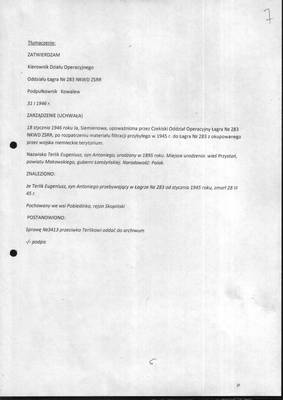 18 января 1946 года я, п/оперуполномоченная Опер-Чекисткого отдела лагеря № 283 НКВД СССР СЕМЕНОВА, рассмотрев материалы фильтрации в отношении прибывшего в 1945 году в лагерь № 283 с оккупированной немецкими войсками территории (или стран Европы) ТЕРЛИКА Евгения Антоновича, 1895 года рождения, место рождения: село Пристань Маковского уезда Лумженской губернии, поляк.