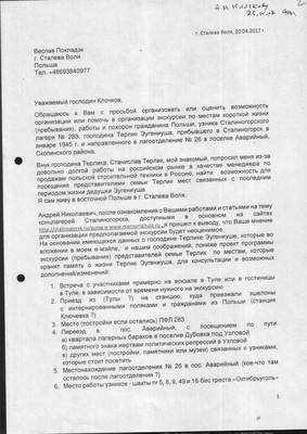 Обращаюсь к Вам с просьбой организовать или оценить возможность организации или помочь в организации экскурсии по местам короткой жизни (пребывания), работы и похорон гражданина Польши, узника Сталиногорского лагеря № 283, господина Терлик Эугениуша, прибывшего в Сталиногорск в январе 1945 г. и направленного в лагоотделение № 26 в поселке Аварийный, Скопинского района.