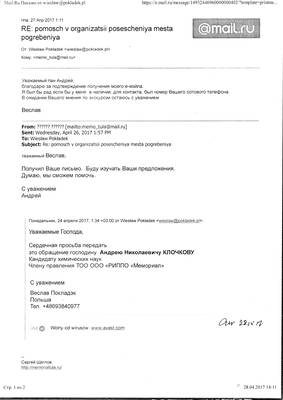 24.04.2017 - From: Wiesław Pokładek to:memo_tula@mail.ru