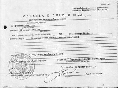 6. Справка о смерти Краснобаевой А.Г. № 206, умершей 21.01.2006 г., выданная отделом ЗАГС Зареченского р-на гор. Тулы 23.01.2006 (1 лист)