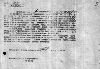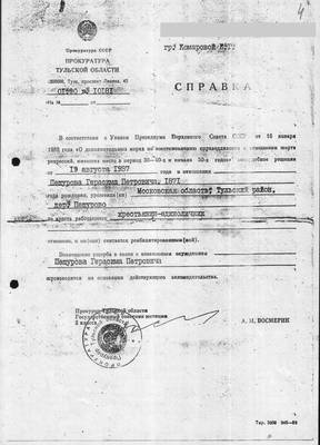 4. Справка о признании Краснобаевой Антонины Герасимовны пострадавшей от политических репрессий № 18155, выданная Прокуратурой Тульской области 26.03.1996