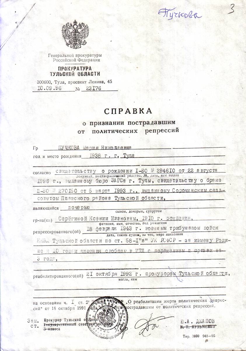 3. Справка о признании Пучковой М.И. пострадавшей от политических репрессий No 23176, выданная Прокуратурой Тульской обл. 10.09.1996