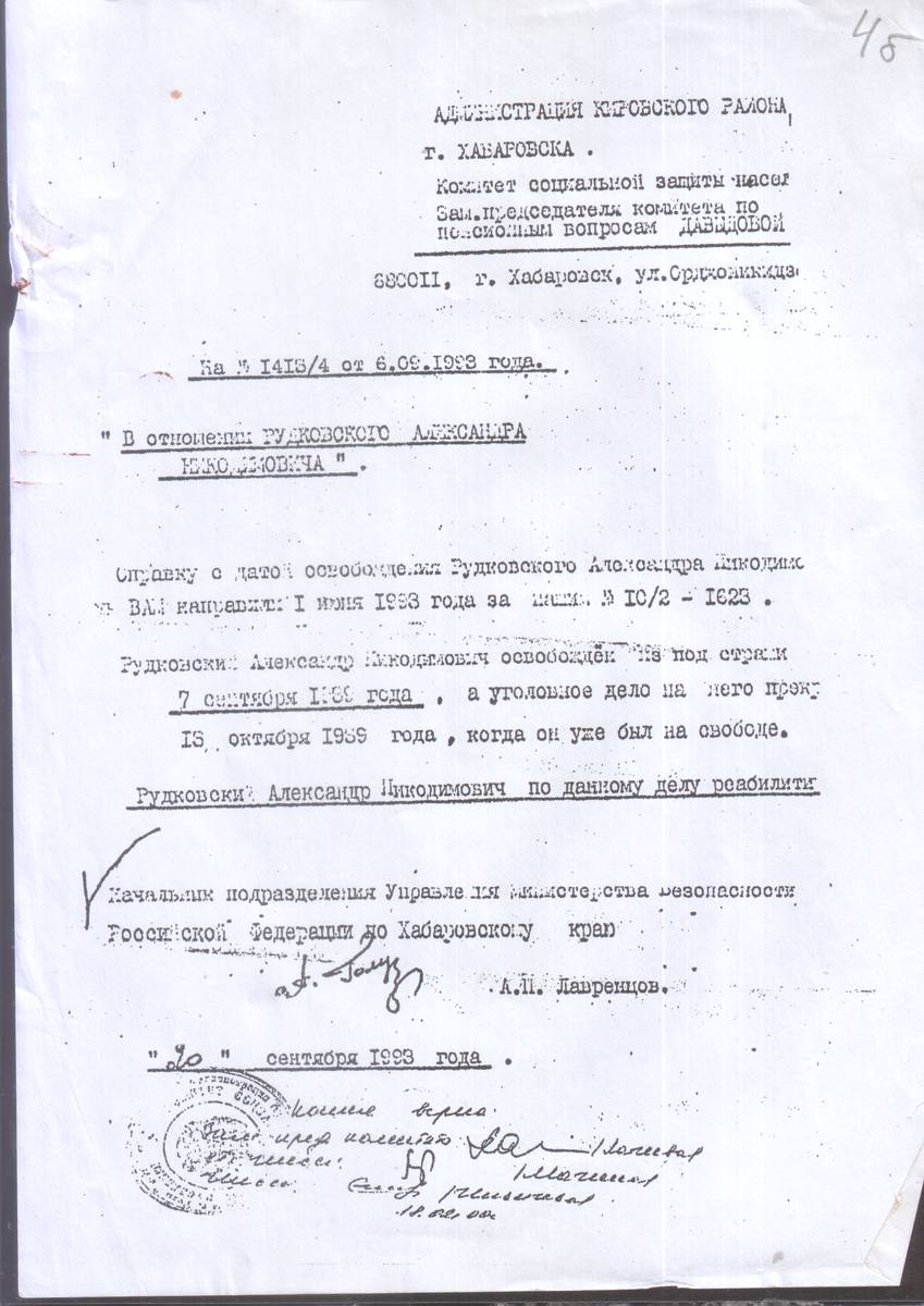 5. Письмо Комитета соц. защиты при администрации Кировского р-на г. Хабаровска на запрос 1413/4 от 06.09.1993 с выпиской об освобождении Рудковского А.Н. выданная Управлением МГБ РФ по Хабаровскому краю от 20.09.1993 (3 листа)
