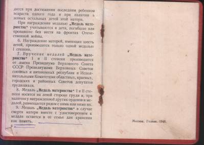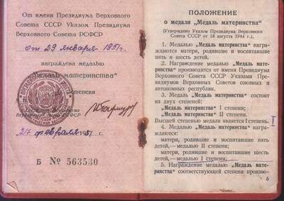 16. Удостоверение Сидоровой Ксеньи Алексеевны к награде "Медаль материнства" 1 степени, серия Б № 563530 от 29 января 1951 г. (6 листов)