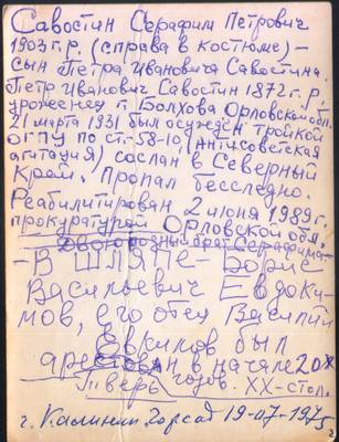 На снимке: слева направо в первом ряду: Василий Сидоров (погиб), Василий Сидоров-младший, Алексей Иванович Сидоров, Егор Сидоров. Во втором ряду: Тихон Сидоров (погиб), Серафим Савостин (отец автора), Никита Сидоров (погиб).