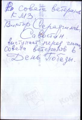 14. Фото. Савостин Виктор Серафимович выступает перед членами Совета ветеранов КМЗ в День Победы (2 листа)