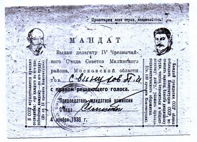 7. Мандат делегата IV Чрезвычайного съезда Малинского р-на Московской обл. тов. Свинухова П.И. 04.11.1936 (2 листа)