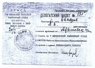 11. Делегатский билет № 135 Свинухова П.И., делегата 7-го Веневского районного съезда Советов РК и К депутатов 20.01.1931 (2 листа)