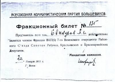 10. Фракционный билет № 135 члена Фракции ВКП(б) 7-го Веневского очередного Районного съезда Советов РК и К депутатов Свинухова П.И. 20.01.1931 (2 листа)
