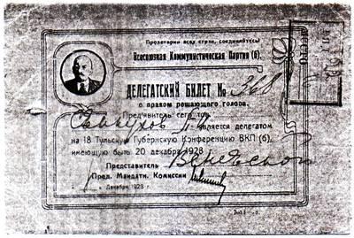 8. Делегатский билет № 368 с правом решающего голоса делегата от Веневского уезда Свинухова П.И. на 18-ю Тульскую Губконференцию ВКП(б). 20.12.1928 г.