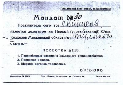 9. Мандат № 30 тов. Свинухова, делегата от Тульского округа на Первый (учредительный) съезд колхозов Московской обл.