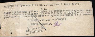 Выписка из Приказа No 75 по. 907 ДЭУ от 1 Июля 1937г.