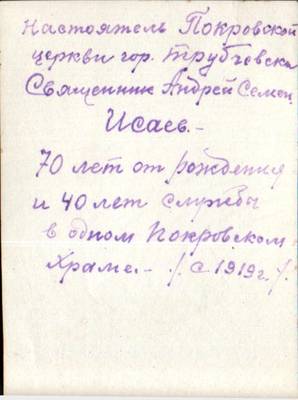 25. Фотопортрет настоятеля Покровской гор. Трубчевска церкви Исаева Андрея Семеновича, служивщего в храме 40 лет в день его 70-летия. (2 листа)