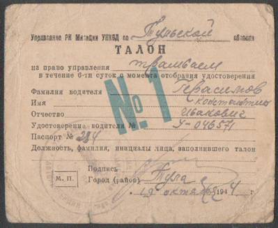 19. Талон на правл управления трамваем Герасимова К.И. (2 листа)