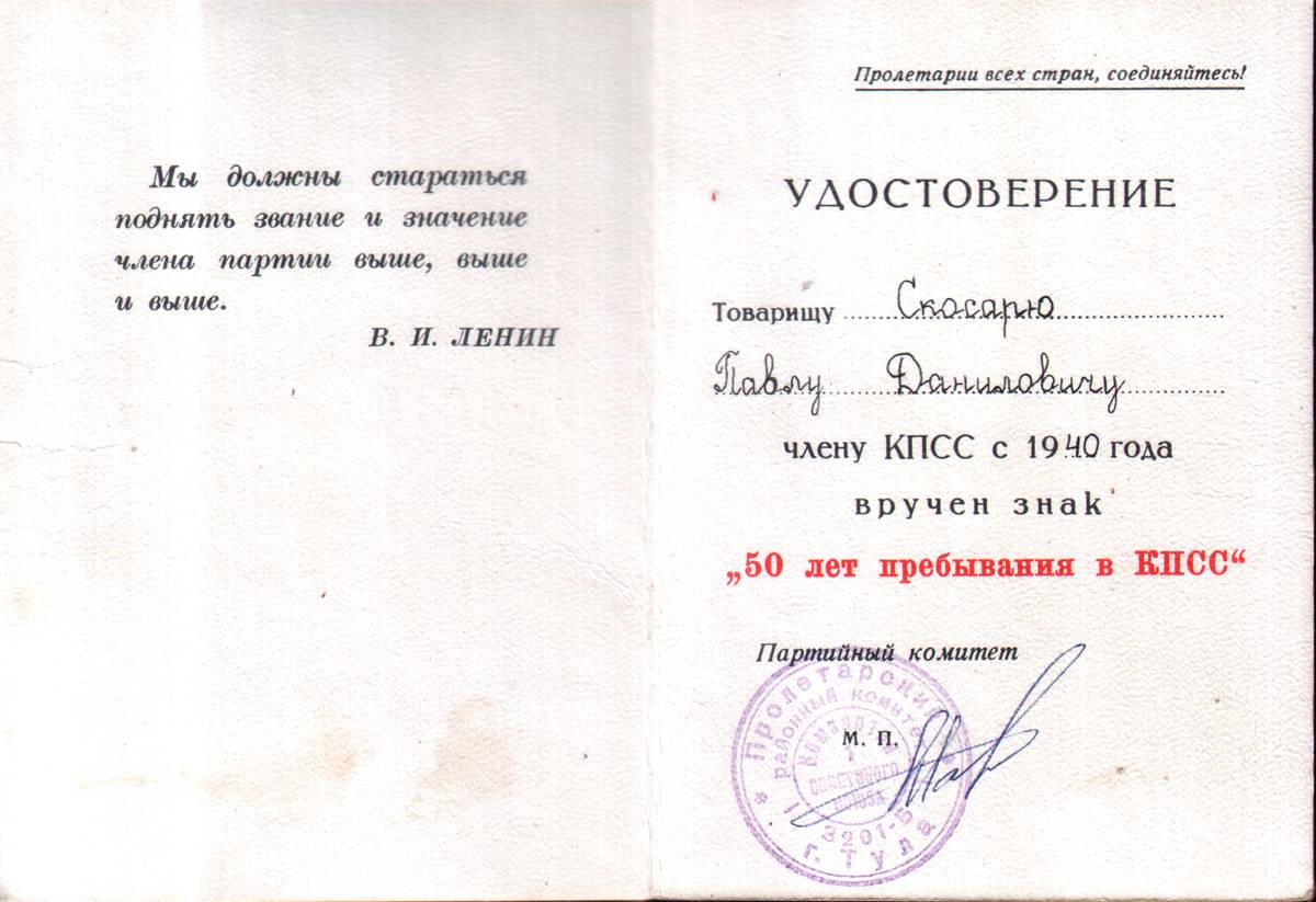 61. Удостоверение о вручении члену КПСС с 1940 г Скосарь П.Д. знака "50 лет прибывания в КПСС (2 листа)