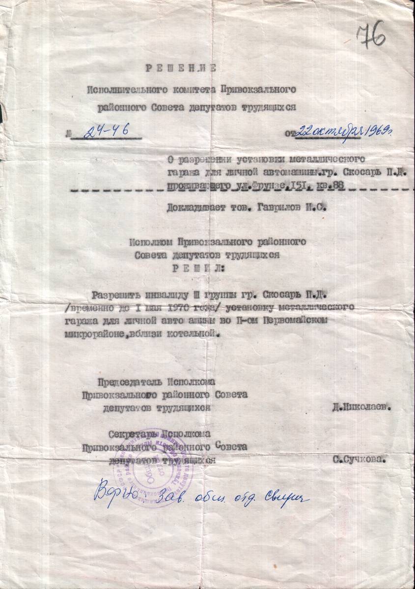 51. Разрешение Скосарю П.Д. на установку временного металлического гаража (1 лист)