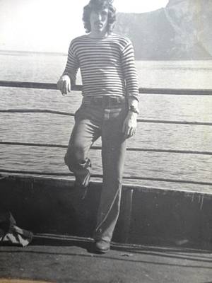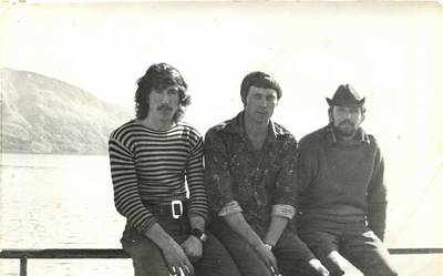 Фото: Виктор Рау (крайний справа) с товарищами в его период работы на рыболовецкой плавбазе на берегу моря Японского моря, бухта Преображенье (Приморский край)