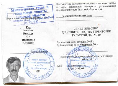 2. Удостоверение на право получения Рау В.И. мер соцподдержки, выданное Министерством труда социальной защиты Тульской области 28.10.2013 г.