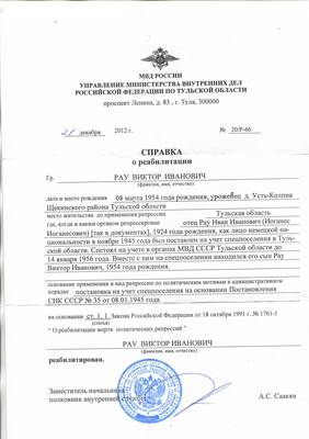 1. Справка о реабилитации Рау Виктора Ивановича, выданная УМВД по Тульской области 21 декабря 2012 r. No 20/P-66