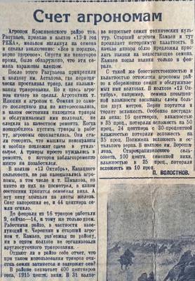 С такой же безответственностью и халатностью относятся агрономы райзо к сбережению семян в обслуживаемых ими колхозах. В колхозе «12 октябрь», например, семена повышенной влажности засыпаны слоем больше двух метров. Зерно портится и теряет всхожесть. Особенно пострадала вика: 16 центнеров, влажностью в 35 проц., потеряли всхожесть на 50 проц., 24 центнера с 30-процентной на влажностью потеряли всхожесть 35 проц. Понижена всхожесть и остального зерна. В колхозе им. Ворошилова Старокрапивенского сельсовета, 100 центн. семенной вики, влажностью в 25 проц., потеряли всхожесть на 10 проц.