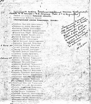 1. Приложение к письму на 2-х листах - Список уроженцев Тульской области, включенных в Книгу памяти «Расстрельные списки Коммунарка, Бутово»