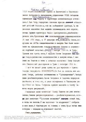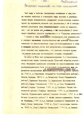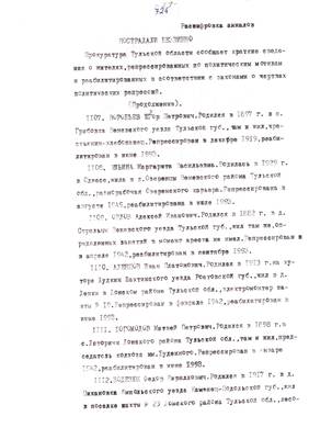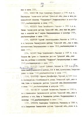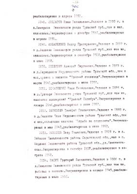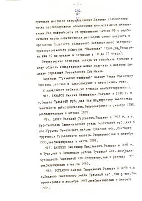 3. Очерк о репресс. жителе г. Суворова Решетове Ив.Ив. (без начала). Списки репрессированных с N 973 -997 // Тульские известия, 1994 - 30 янв. (машинопись) (5 листов)