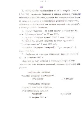 ВЫПИСКА из протокола заседания комиссии по историческому наследию при Администрации г. Тулы от 24.08.95г.