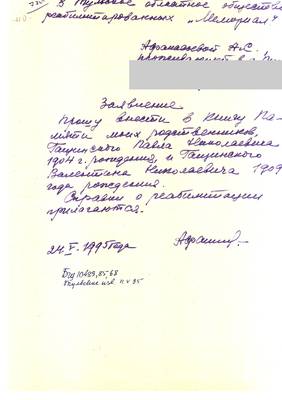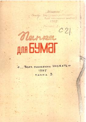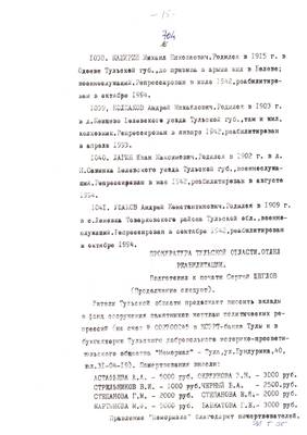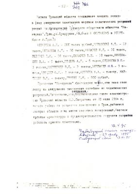 6. Списки репрессированных №№ 1042 – 1080 для газеты Тульские известия (Опубл. 04.03.1995). Списки жертвователей на памятник (27.02.95). Благодарность стройконторе за ремонт помещения Мемориала (23.02.95)