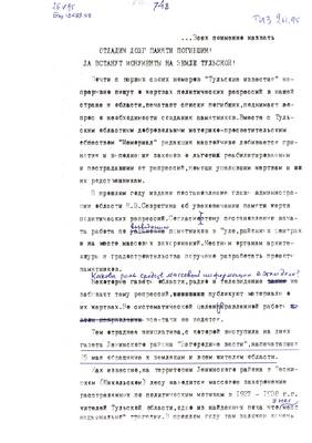 53. Не быть миллионам жизней - на свалке истории. В Туле открывается памятник жертвам репрессий. С. Щеглов. - Подготовительные материалы для Тульских известий (20.10.95) (3 листа)